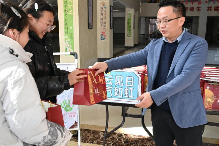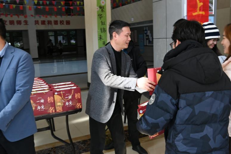 随后,学院领导与老师们共同为考研学子分发了精心准备的“考研助力包”。助力包装载着学院的深情厚谊与美好祝愿,其中包含:寓意“心想事成”的橙子、象征“欢乐顺遂”的乐事薯条、代表“牛气冲天”的旺仔牛奶、实用温暖的暖宝宝、印有祝福语的纸巾以及齐全的考试工具。每一份礼物都寄托着学院对学子们的细致关怀,期盼他们在考场上从容应对,发挥出色。