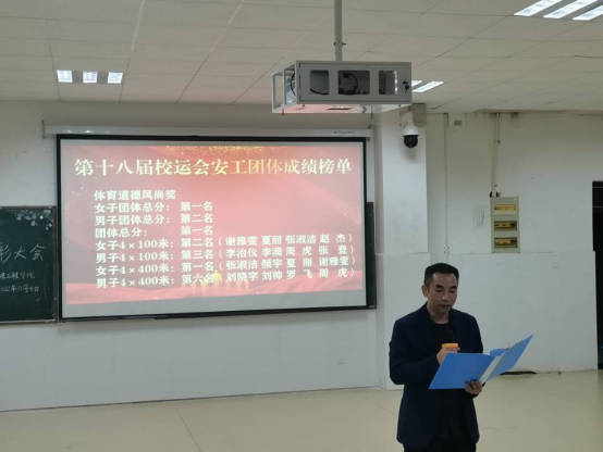 黄宏格宣读了《安全与管理工程学院关于表彰第十八届校运会先进集体和先进个人的决定》。与会嘉宾分别为获奖运动员、优秀运动员、国旗队优秀教官、方阵队优秀队员、优秀工作者以及优秀班级代表颁奖并合影留念。