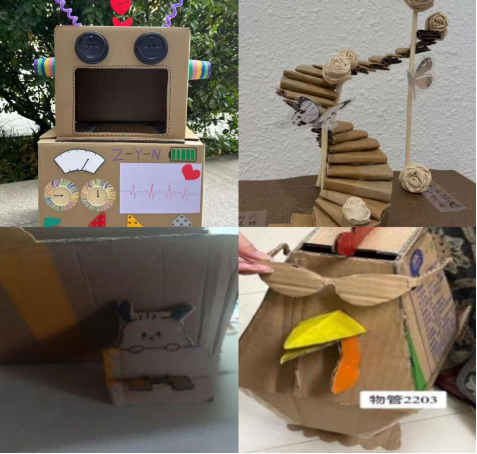 为提高学生环境保护意识和废物利用意识,推动资源循环利用,营造绿色环保的氛围,安工学院结合物流、物管专业特色,开展以“奇思妙箱,不纸于此”为主题的劳动教育特色活动。全体学生收集废弃快递盒、纸箱,发挥想象做出一个个形象生动有趣的小动物,或实用性功能性突出的收纳盒等小物件,引导学生树立节约资源、保护环境的意识,鼓励学生敢于动手、敢于创新。