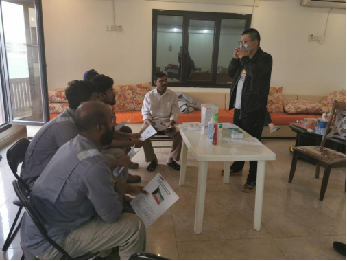 戴郑翌得知科威特地区首例确诊情况之后,做的第一件事就是召集外籍劳工进行安全教育,讲解关于防疫的问题和措施,并且分发防疫用品,以此保证劳工们的安全。在党支部书记的指示下,他迅速将外籍人员安置在项目驻地进行统一管理。