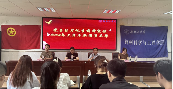 6月18日,材料科学工程学院在材化楼1301报告厅开展2024年上半年入团仪式暨团学干部大会。党委副书记李前奔、辅导员王安东、谌雯洁出席,全体团学干部、上半年新发展团员参加,分团委副书记罗心阳主持会议。