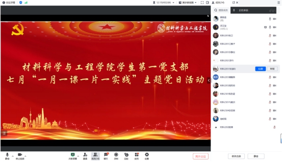 7月12日,材料科学与工程学院学生第一党支部线上开展七月“一月一课一片一实践”主题党日活动,支部全体党员参加,支部书记黄柳柔主持会议。