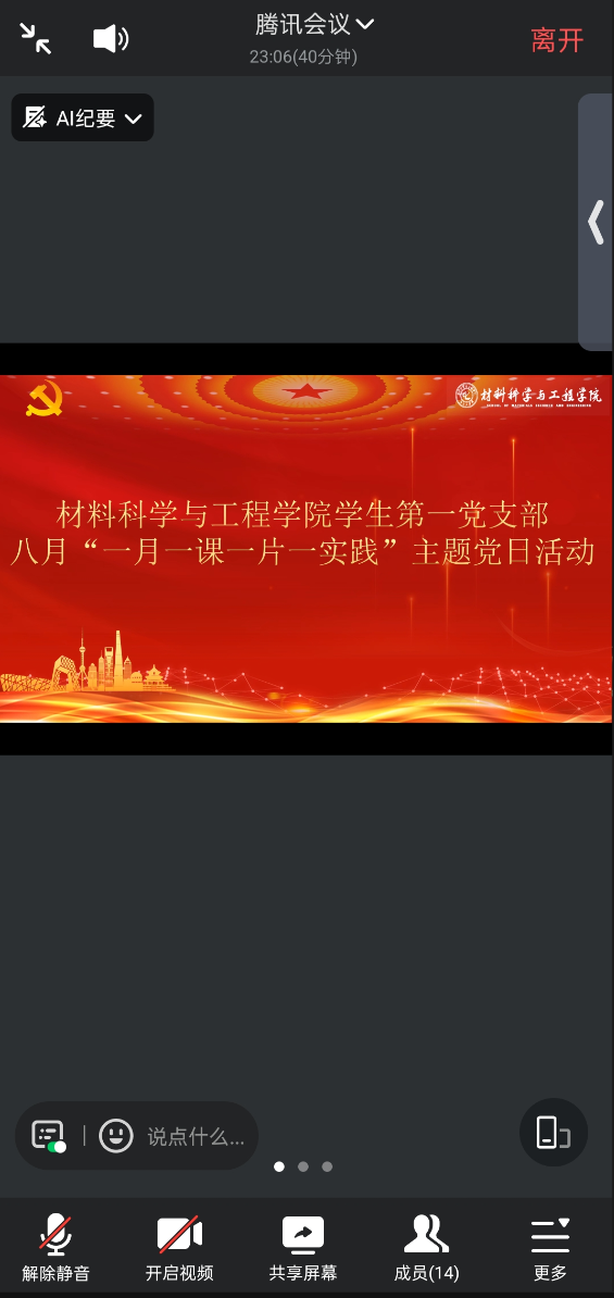 8月23日,材料科学与工程学院学生第一党支部线上开展八月“一月一课一片一实践”主题党日活动,支部全体党员参加,支部书记黄柳柔主持会议。