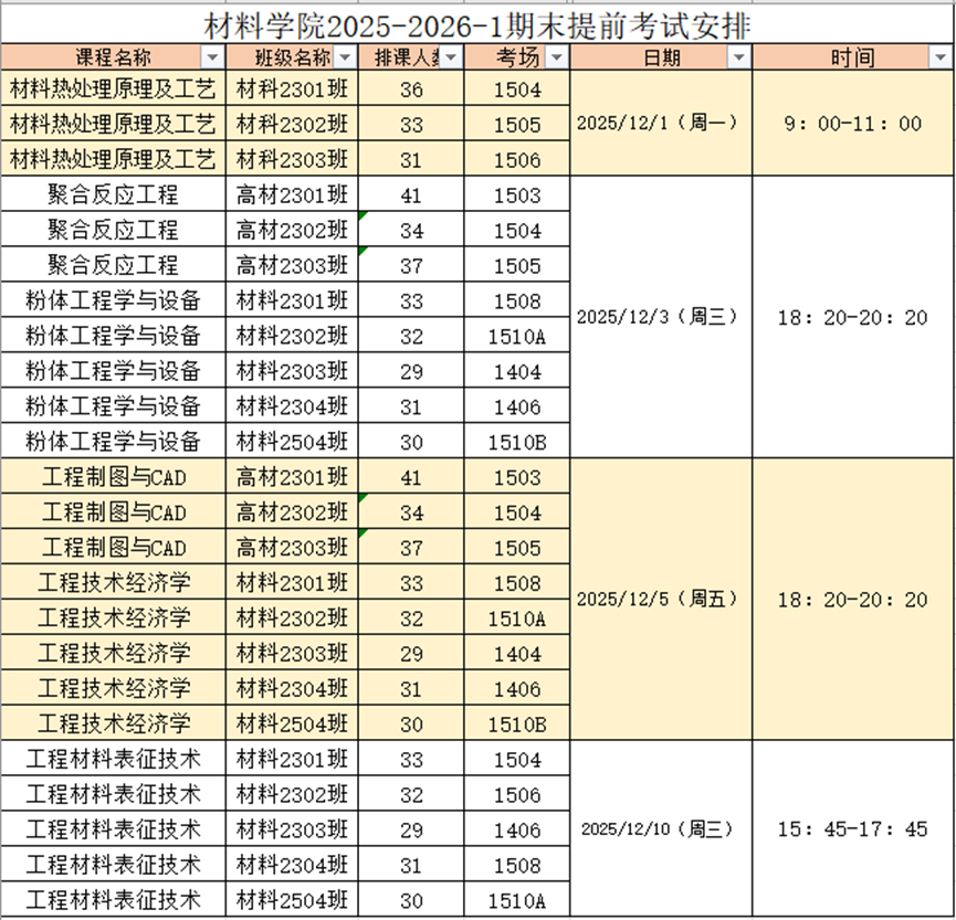 材料科学与工程学院2025-2026-1学期期末提前考试时间2025年12月1日、12月3日、12月5日和12月10日,具体时间安排如下表所示,无故缺考者将不能报名下学期期初补考,请同学们准时参加考试。