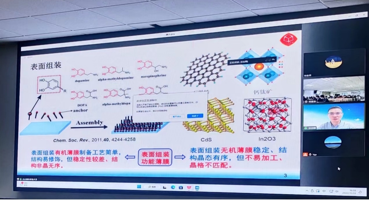 谷志刚教授以《表面配位金属-有机框架薄膜(SURMOFs)的研究》为题详细介绍了金属-有机框架(Metal-Organic Frameworks, MOFs)的性能与结构特点及应用前景,对其合成方法和相关设备的研制进行了深入地介绍。MOFs是一种具有拓扑结构多样性、比表面积大、热稳定性好、功能可调节及其同时兼具无机和有机薄膜特性等优点的多孔配位聚合物(Porous Coordination Polymers, PCPs)。谷志刚教授自主研发的液相外延层技术组装MOFs薄膜并在国内首次开展SURMOFs的研究,并利用自主研发的薄膜技术创制一系列新型功能SURMOFs;率先研究负载型SURMOFs的制备策略与功能应用;开拓SURMOFs在非线性光限幅、手性光学等多个应用研究,为晶态多孔薄膜材料在实际应用中提供了新型材料和新应用。