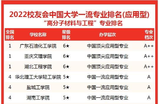 近日,全国第三方大学评价机构艾瑞深校友会网(Cuaa.Net)正式发布的2022中国大学一流专业排名。开元官网无机非金属材料工程荣获6星级应用型专业,荣居校友会2022中国大学无机非金属材料工程专业排名(应用型)第一,挤进中国顶尖应用型专业行列。另外,开元官网高分子材料与工程专业也荣获5星级应用型专业,位列全国高校前茅。