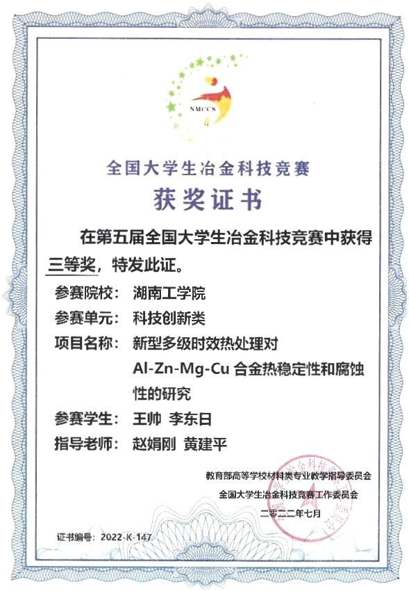 2022622日至30日由教育部高等学校材料类专业教学指导委员会主办的第五届全国大学生冶金科技竞赛在江苏科技大学进行。开元集团网站材料学院金属材料专业学生王帅李东日所组成的团队以“新型多级时效热处理对Al-Zn-Mg-Cu合金力学性能和腐蚀性能的影响”作为参赛作品,获得了本次比赛三等奖指导老师是赵娟刚和黄建平老师