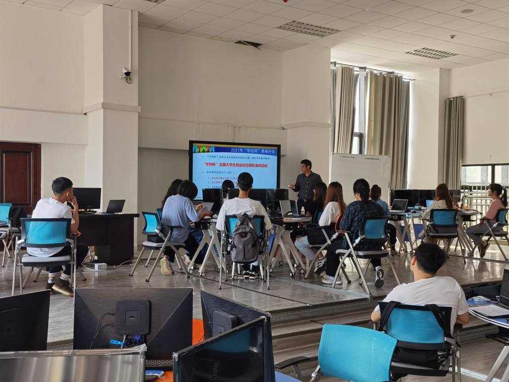 4月24日上午,创新创业就业学院在创新创业测评实验室成功举办了“学创杯”2021全国大学生创业综合模拟大赛专题培训,培训共有学生、指导老师近20余人参加。
