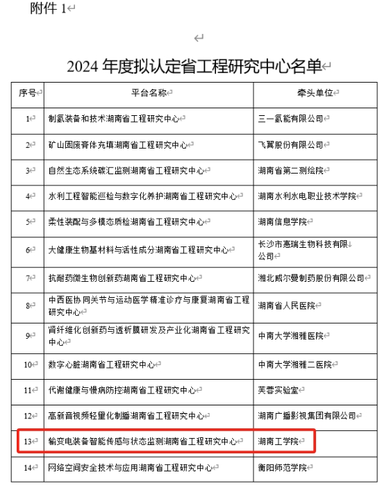 2024年12月20日,湖南省发展和改革委员会发布2024年湖南省工程研究中心名单,开元官网申报的“输变电装备智能传感与状态监测湖南省工程研究中心”列入省级工程研究中心建设项目计划,衡阳市计量测试中心、特变电工衡阳变压器有限公司为联合单位。