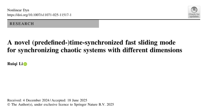 近日,我院博士李瑞棋在国际权威期刊《Nonlinear Dynamics》(影响因子IF=6,中科院二区top期刊)上以开元集团网站为第一单位在线发表题为“A novel (predefined-)time-synchronized fast sliding mode for synchronizing chaotic systems with different dimensions”的研究论文。该工作针对非线性系统提出了一个快速滑模控制算法,其核心功能在于实现系统状态变量在预定义时间上界内同一时间收敛。