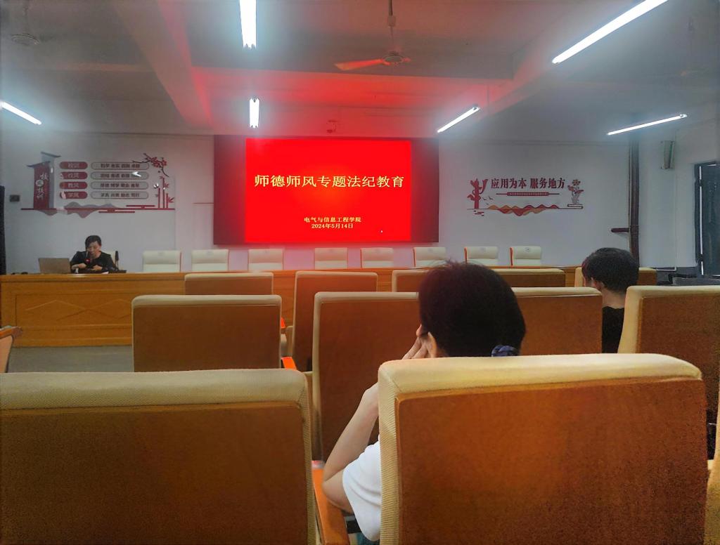 5月14日下午,电气与信息工程学院在3312会议室召开全体教职工大会暨师德师风专题法纪教育学习会。电信学院全体教职工参会,会议由院党委书记俞斌主持。
