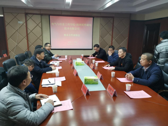座谈会上,曹执令校长对深圳柔性磁电技术有限公司代表的到来表示热烈欢迎。董佑云董事长介绍了深圳柔性磁电技术有限公司的基本情况、目前开展的主要工作。李祖林院长介绍了电气与信息工程学院的基本情况、专业人才培养方案、共建科研团队等校企产学研合作情况。学院实验室主任王勇刚对自动化产线改造项目前期调研情况进行了汇报。