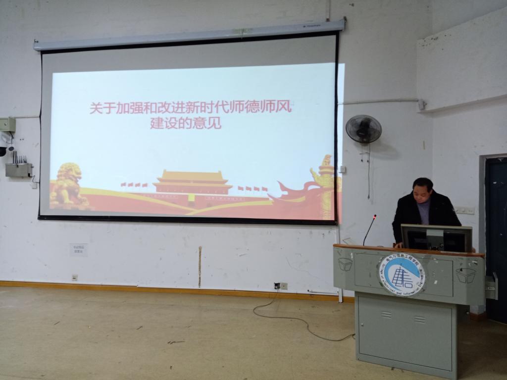 党委书记书记范志明做最后总结,强调教师要加强师德师风建设,并带领大家学习了《关于加强和改进新时代师德师风建设的意见》文件精神和卢永根先进事迹。