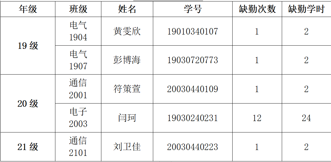 电气与信息工程学院 2021-2022-1学期第十周课堂考勤表情况通报