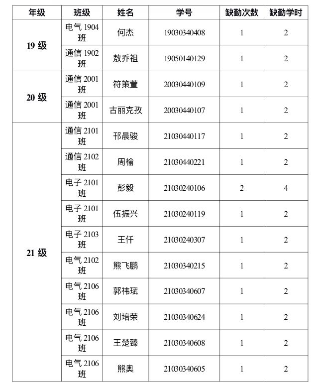 电气与信息工程学院 2021-2022-1学期第十一周课堂考勤表情况通报
