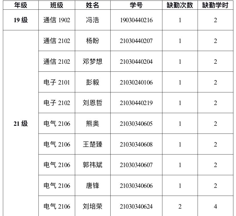 电气与信息工程学院 2021-2022-1学期第十二周课堂考勤表情况通报