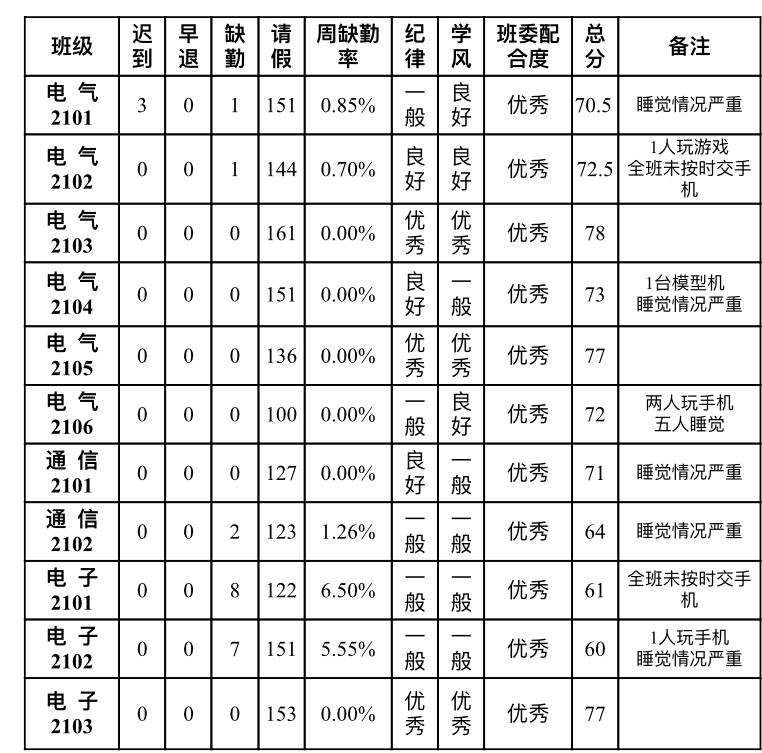 本周红榜:电 气2103班、电 气2105班、电 子2103班