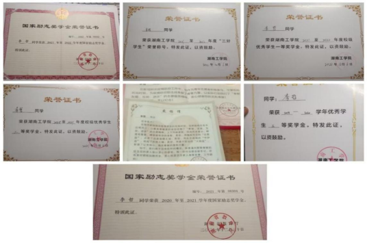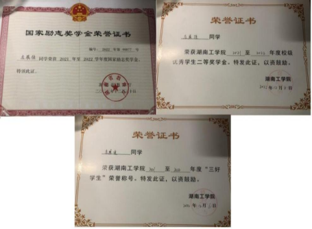 在校期间荣获国家励志奖学金、校级一等奖学金、校级二等奖学金、两次校级三好学生。2021全国大学生电子设计大赛省级三等奖,第六届学生思想政治理论课研究性学习成果展示竞赛校级二等奖。