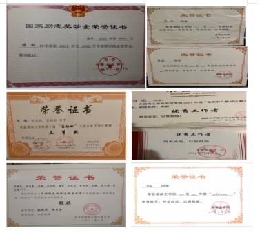 在校期间,曾获得国家励志奖学金、校级一等奖学金两次、校级三等奖学金、校级三好学生、校级优秀团干、校级优秀团员等;在课外生活中,曾多次参加社团活动及比赛,获得“圆融杯”电子设计竞赛校级三等奖、机械创新设计大赛校级三等奖。并在新生才艺大赛上获得最佳团体奖、最佳组织奖。