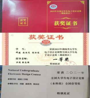 2022年9月获湖南省电子设计大赛三等奖。