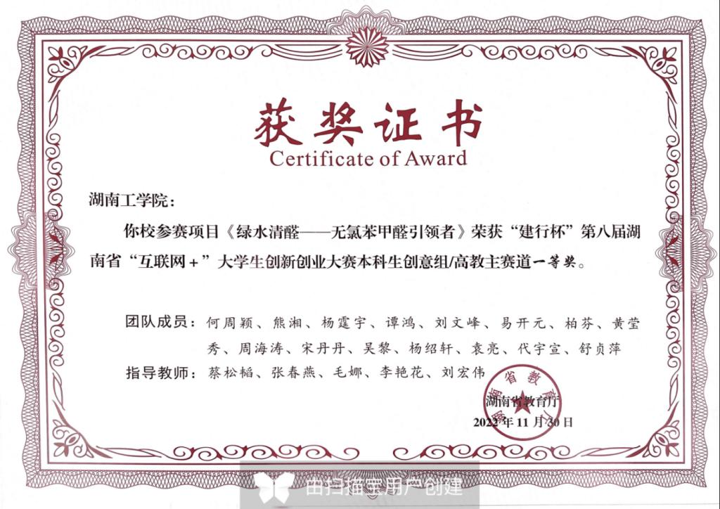 项目团队历时4年多的调研、探索、研发、立项孵化和中试推进工作,项目团队现进行产品迭代开发,目前团队核心成员现拟申请相关发明专利3项目,实用新型专利3项,团队学生以第一作者已发表高水平科研论文1篇。现已在衡阳瀚石科技、长沙嘉宇新材料有限公司开展中试,并签署了合作协议,苯甲醛产品现已经通过第三方权威机构检测。