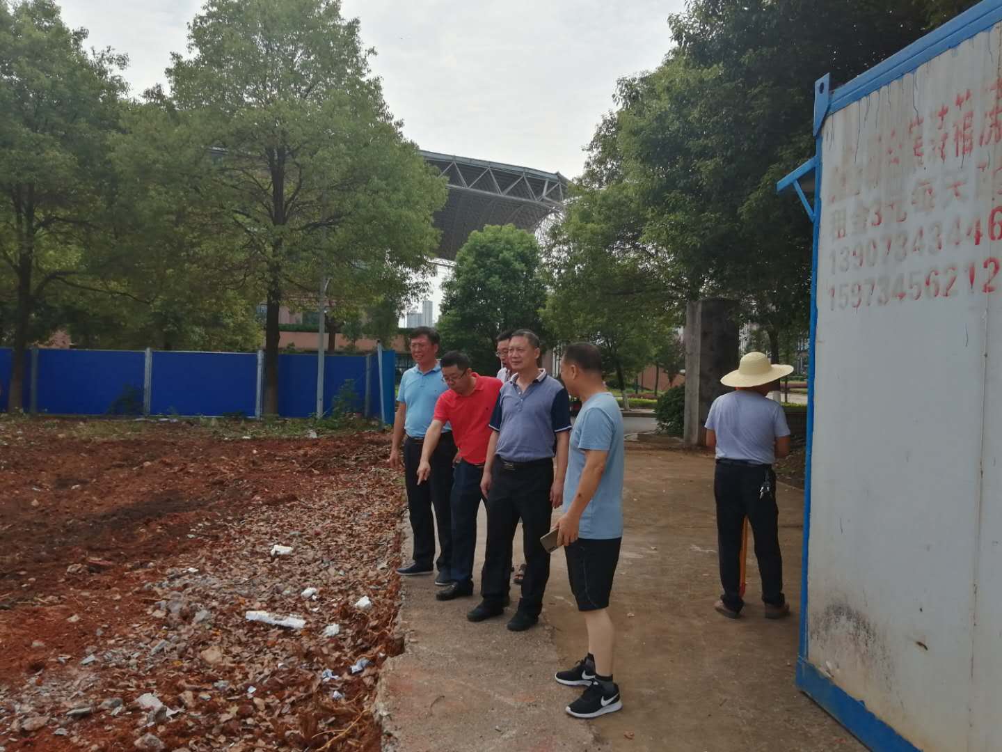 罗建华一行来到顺枫公寓A区食堂北面正在修建的羽毛球网球和运动器械场,看到该区域已经围挡施工,地面土方已经整平,各项基础工作已经就绪。罗建华要求,基建处要加强施工监管,把握时间节点,督促施工方抢抓工期,要在新生开学前完工并投入使用。