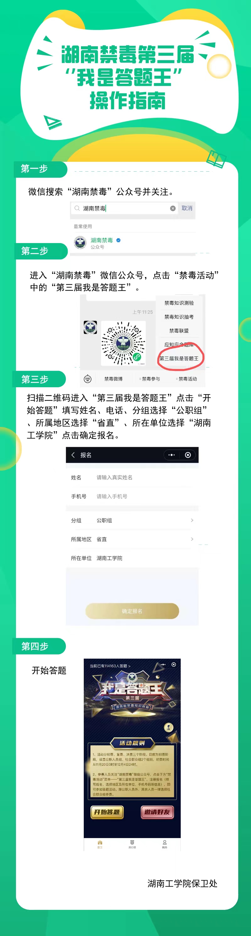 根据湖南省禁毒委《关于组织开展第三届“我是答题王”湖南省禁毒知识竞赛的通知》要求,2020年11月20日至12月4日举行第三届“我是答题王”禁毒知识竞赛初赛,要求开元官网教职员工全员参(参赛人员关注“湖南禁毒”微信公众号,点击下方“禁毒活动”菜单-“第三届我是答题王”,注册报名,即可参加答题活动)。