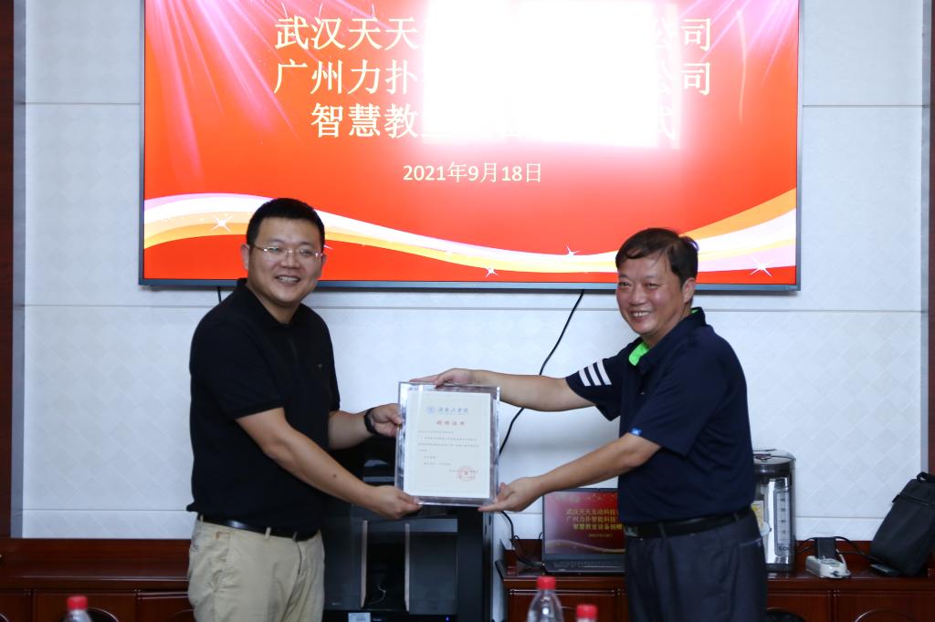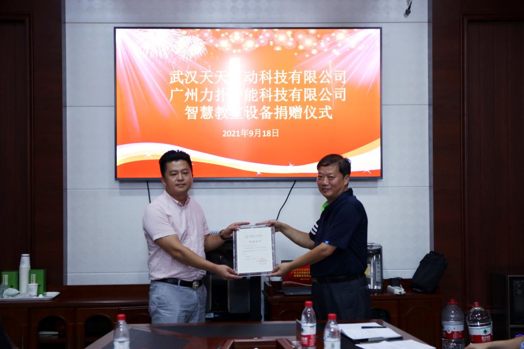 黄红卫致欢迎词,他表示:“此次两家爱心企业为开元官网捐赠智慧教学设备,以服务教学为核心,以课堂为突破口,提供了教室智能管控、课堂互动、教学大数据服务一体化平台。通过采用人工智能、物联网、大数据和云计算等新技术围绕课前、课中、课后教学闭环,实现动态教学数据全采集,助力学校教学改革。”随后,黄红卫为武汉天天互动科技有限公司和广州力扑智能科技有限公司代表颁发了捐赠证书。