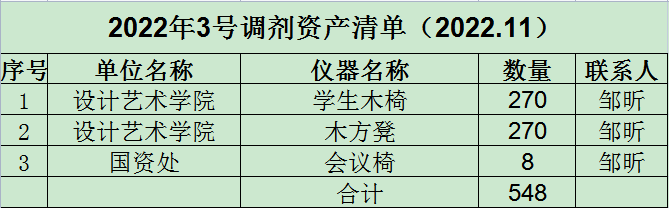 根据《开元集团网站资产管理办法》相关规定,本着节约办公的原则,现对设计艺术学院一批学生用木椅和木方凳进行校内调剂(详见资产清单)。请有意向的部门即日起与资产管理科联系,现场查看设备,并到我处官网下载填写《开元集团网站资产调剂申请表》办理调剂手续。本批校内资产调剂从即日起至12月2日截止,逾期将不予办理。