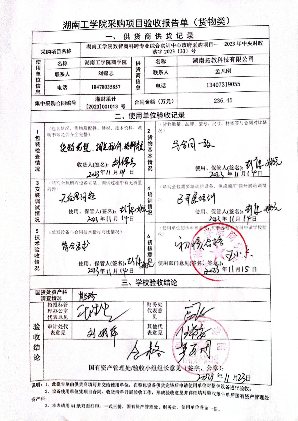 根据国有资产管理处对采购项目的验收安排,2023年11月17日国有资产管理处组织招投标管理与服务中心、审计处、财务处、教务处以及使用部门代表对供应商的货品进行现场验收。