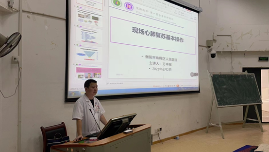 本次培训主讲专家为衡阳市珠晖区人民医院急诊科万中辉主任和护理部成莉主任,万主任进行了急救学知识的宣讲和介绍,成莉主任现场进行心肺复苏实际操作和模拟演练,并在旁指导志愿者参与操作,从而加强亲身体验,进一步保证急救技能的学习和巩固。