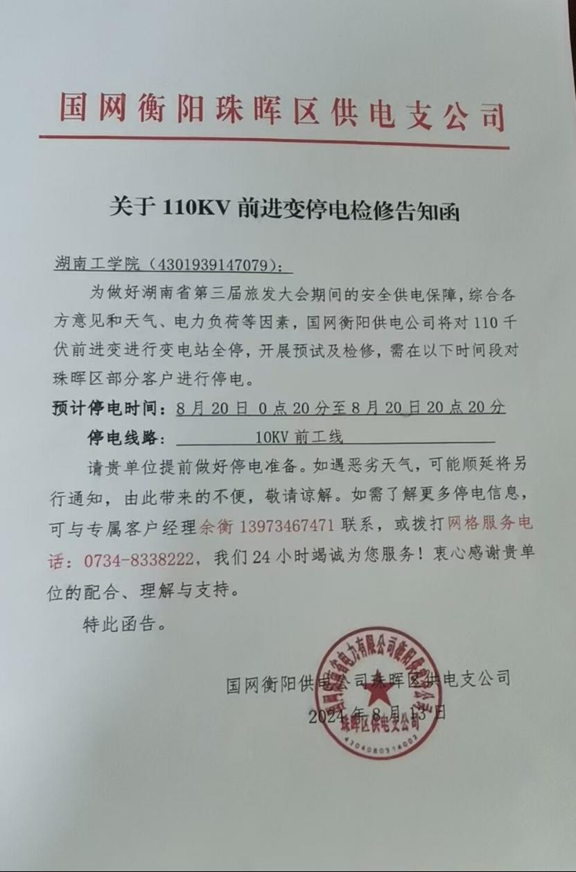 国网衡阳供电公司2024年8月20日0点20分-20点20分对前进变电站升级改造,开元官网前工线将停止供电,为保障学校正常用电,我处将同期进行倒闸操作,相应的停电时间及停电区域如下: