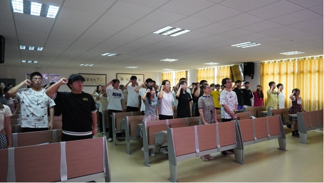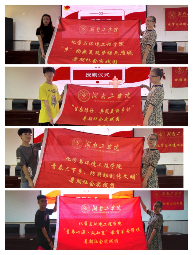 冯智发宣读了参加2023年大学生暑期“三下乡”社会实践活动的团队名单,蔡玲为各实践团队授旗。