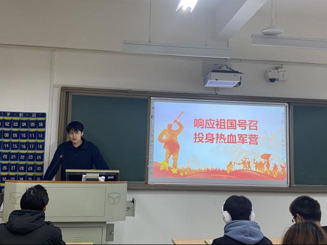 “去时懵懂少年,归时顶天立地。”为强化高校学生国防观念,号召适龄青年参军入伍,化学与环境工程学院分别于11月13日、14日晚7点在社科楼104及社科楼109举办了征兵宣传活动。学工办主任兼分团委书记陈凌霄出席,退伍复学的同学以及大一新生参加本次活动。