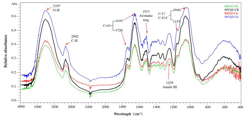 图1 茄子高、低镉积累品种在对照和镉处理下根细胞壁傅里叶红外变换光谱分析