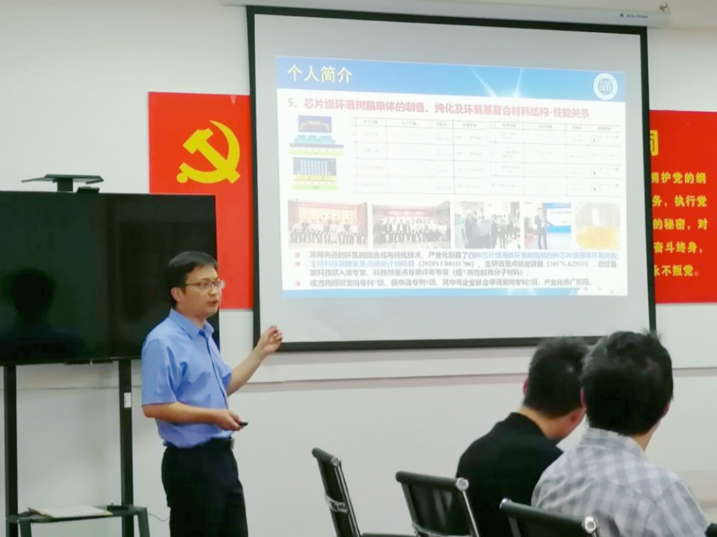 吴志民教授以“芯片级环氧树脂单体的制备、纯化及应用”为题,针对后摩尔时代芯片封装技术所面临的挑战和高端环氧塑封料制备过程所遇到的问题,结合自己的研究领域和内容,深入浅出地讲解了了自己的解决方案。本报告围绕后摩尔时代的芯片封装技术、高端环氧塑封料的挑战、芯片级环氧树脂的制备与纯化以及环氧基复合材料的结构与性能等四个方面展开。