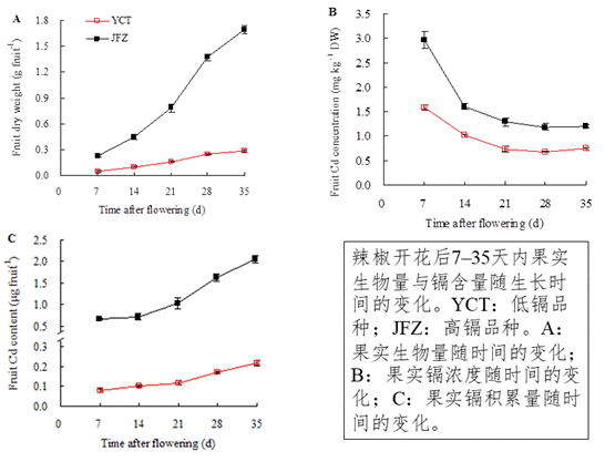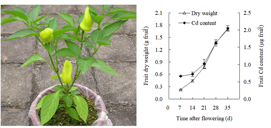 通过对辣椒全生长期的跟踪试验首次发现,辣椒果实镉浓度随着生长时间的延长而降低,即嫩辣椒镉浓度高于老辣椒。高镉辣椒品种从根向茎叶转运镉的能力更强,转运速度也更快。辣椒品种间果实镉含量差异的形成也与茎叶通过韧皮部向果实转运镉的能力有关。
