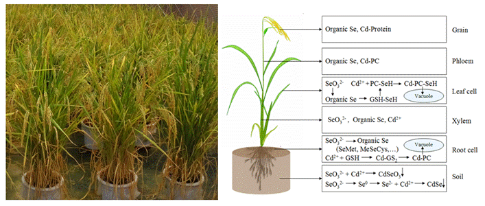 通过杂交获得了低镉高产的水稻杂交一代,证明了水稻低镉积累的特性是可稳定遗传的,传统的“三系杂交”培育高产低镉杂交水稻品种是可行的。发现硒可以显著减少水稻吸收镉,降低镉从茎叶向糙米转运;镉主要是影响水稻对硒的吸收,但并不影响体内硒的转运。