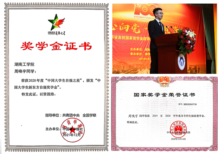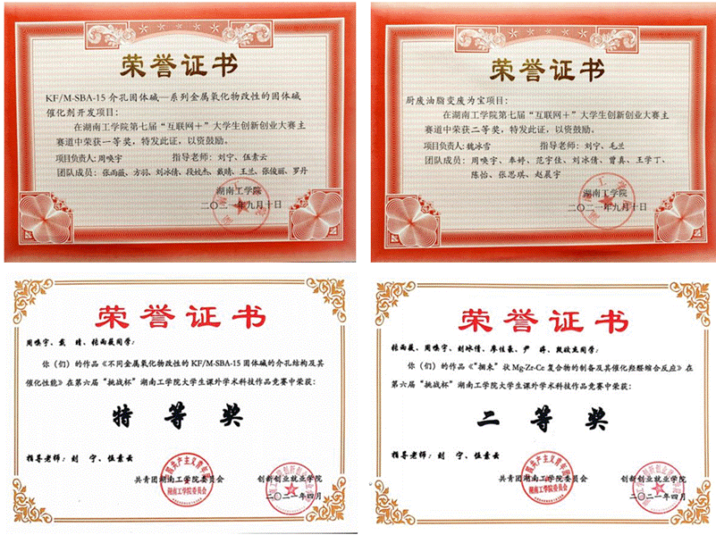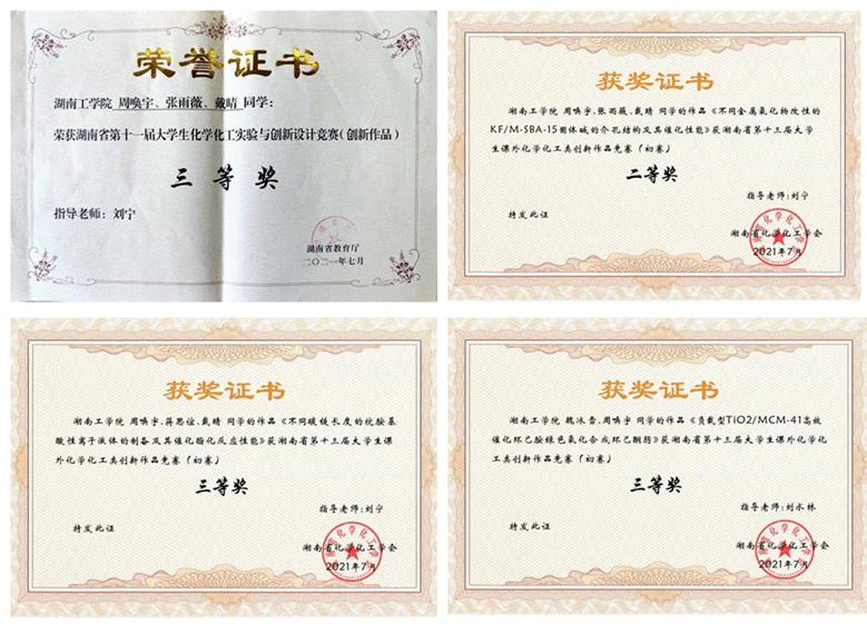 周唤宇同学积极参加各种化工学科竞赛,2021年上半年,获得湖南省第十三届大学生课外化学化工类创新作品竞赛二等奖1项、三等奖2项,湖南省第十一届大学生化学化工学科竞赛三等奖1项。