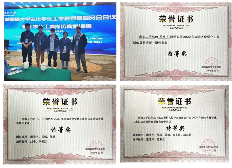 在2020年下半年,湖南省举办首次化学化工虚拟仿真比赛,周唤宇同学抓住机会,代表学校出战。经过激烈竞争,周唤宇同学提交的作品《比表面积孔径的分布测定》获参赛项目特等奖;由他带领的C.H.队获得湖南省虚拟仿真操作竞赛团体特等奖;并且在操作个人赛中,周唤宇以95.6的成绩获得特等奖。