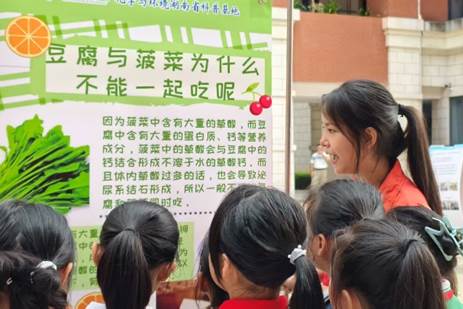 本次活动设置了光敏变色材料、透水混凝土、花园式水泥厂、光伏建筑一体化,以及“化学厨房”“大气污染”“食物相克原理”“密信加密”等多个趣味板块。在实验环节,每个项目均配有详尽的操作指南与原理说明,志愿者不仅在现场进行规范演示,更引导学生细致观察——从透水混凝土遇水快速渗透的“开花”现象,到“密信”中文字随试剂涂抹悄然浮现的神秘过程,这些直观的展示将抽象的化学概念转化为生动的视觉画面,让小学生在亲身体验中轻松掌握科学原理。