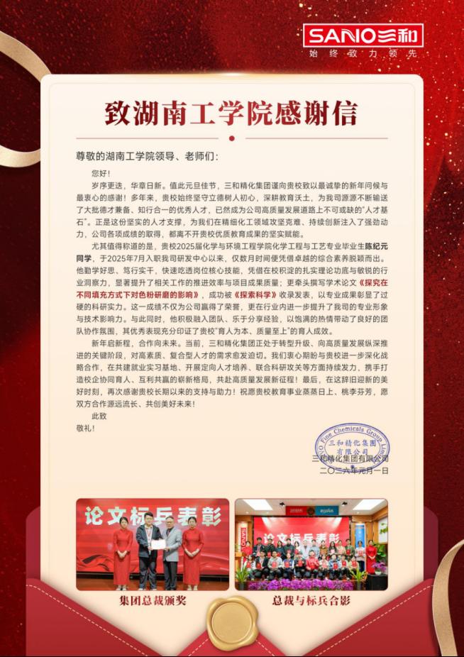 近日,我院收到广东三和精化集团的感谢信,对我院化学工程与工艺专业2025届毕业生王程鹏、陈纪元的工作表现给予高度评价。两名毕业生凭借在校期间积累的扎实理论素养和突出的科研实践能力,入职后迅速融入企业核心岗位,他们的研究成果均被《探索科学》期刊收录发表,展现了个人良好的专业能力,也为企业赢得荣誉。