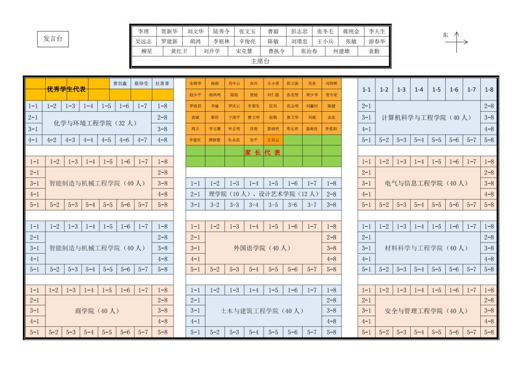 1、会场设主席台、教师座位区、学生座位区、家长观礼区。校领导、学位评定委员会成员在主席台就座,其他领导、教师、优秀校友代表、学生代表、家长代表在指定座位区就座;