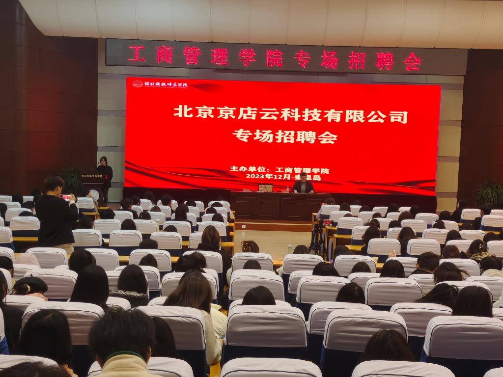 签约仪式后,学院举办“踔厉同行 与榜样共话未来”优秀校友报告会和专场招聘会。优秀校友高玉楠分享自己在母校求学及毕业后工作与创业经历,以自身感受对在校生进行学习、就业、创业指引,与同学们共话未来发展,现场400余名学生听取了此次报告,同时开通网络直播平台为更多在校生提供学习交流机会。在“京电云”专场招聘会中,企业CEO高玉楠从公司概况、经营原则、企业文化和人才战略等方面做了详细介绍,并表示企业处于高速发展的关键时期,需求大量优秀人才,欢迎母校学生加入企业,进一步增强了学院学生求职的信心与动力。