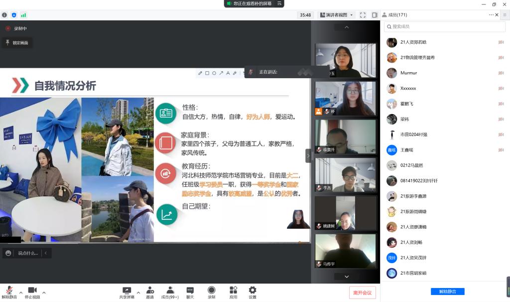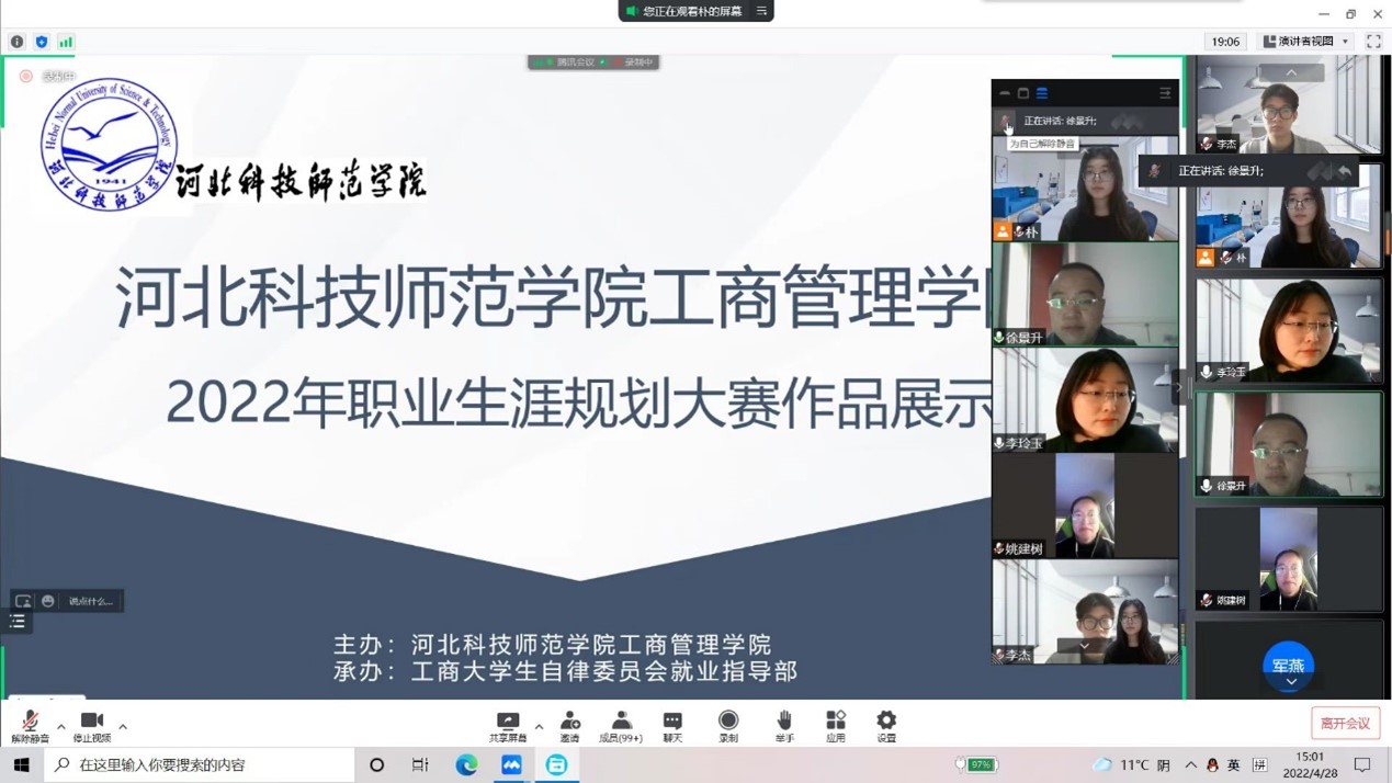 为促进学生提前进行职业规划,进一步提升就业紧迫性和职业竞争力,2022年4月28日,开云kaiyun官网通过“腾讯会议”平台,举办了“规划未来 奋斗青春”职业生涯规划大赛。比赛特邀开云kaiyun官网副书记、学工办主任,以及承担《大学生职业生涯规划》课程授课老师担当评委,来自开云kaiyun官网5个专业的19名选手参加了此次大赛,180余名学生代表观看了职业生涯大赛的优秀作品展播。