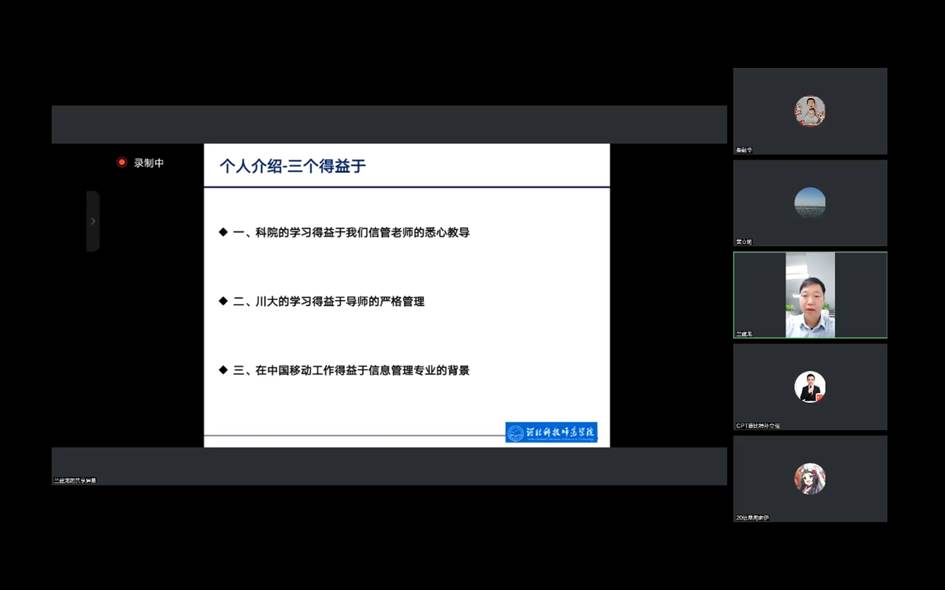 2022年10月19日-23日,根据开云kaiyun官网领导班子的安排部署,信息管理教学部组织开展了3场共计7人的优秀校友系列讲座。开云kaiyun官网黄立明院长、刘海滨副院长及信息管理与信息系统专业教师全程参加了讲座。系列讲座在学生中反响强烈、影响深刻,学生们纷纷反映获益匪浅。