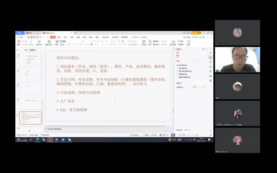 优秀校友兰建龙,结合自身的学习经历和工作行业背景,探讨了当前社会经济变革现状,点出了当前信息行业发展的新契机,并给学弟学妹的职业规划和个人素质培养提出了热忱、中肯的建议。优秀校友孙立强,从学生时代开始讲述自己的学习、奋进到最后成功的经历,深入浅出的讲述了从一个职场小白到职场精英的奋斗历程,为在校生道出了成功的秘籍——拼搏拼搏再拼搏。优秀校友魏秋实,讲述了自己三次考研的经历、读博的感悟,情真意切、感人至深,为在校生讲出了成功的真谛——坚持坚持再坚持。优秀校友贾文赞,讲述了自己从实习到入职入行再到开拓创业的经历,重点分享了自己的发展道路上的挫折及其带来的成长,为在校生点出了成功的阶梯——实干实干再实干。优秀校友刘垒,讲述了自己对于信息系统开发的见解,剖析了性格与岗位选择的关系,真刀实枪,句句发自肺腑,为在校生说出了成功的道路——努力努力再努力。还有余飞、陈建强等优秀校友,也从自己的工作、学习、创业等方面讲述了个人的经历和感悟,为信息管理与信息系统专业的在校生呈现了一系列精彩的讲座。