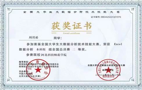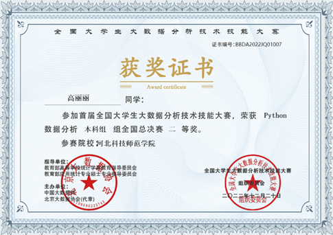 该项比赛是在教育部高等学校统计学类教育指导委员会、教育部应用统计专业硕士专业指导委员会的共同指导下,由中国大数据网联合北京大数据协会联合启动。大赛包括Excel数据分析和Python数据分析两项赛项,周玥希、高丽丽两位同学在2022年11月举行的该项大赛省赛中获得一等奖,取得了参加全国赛的资格。现代表我校在该项大赛全国总决赛中取得佳绩,可喜可贺。(撰稿人:柴朝华,审核人:刘海滨)