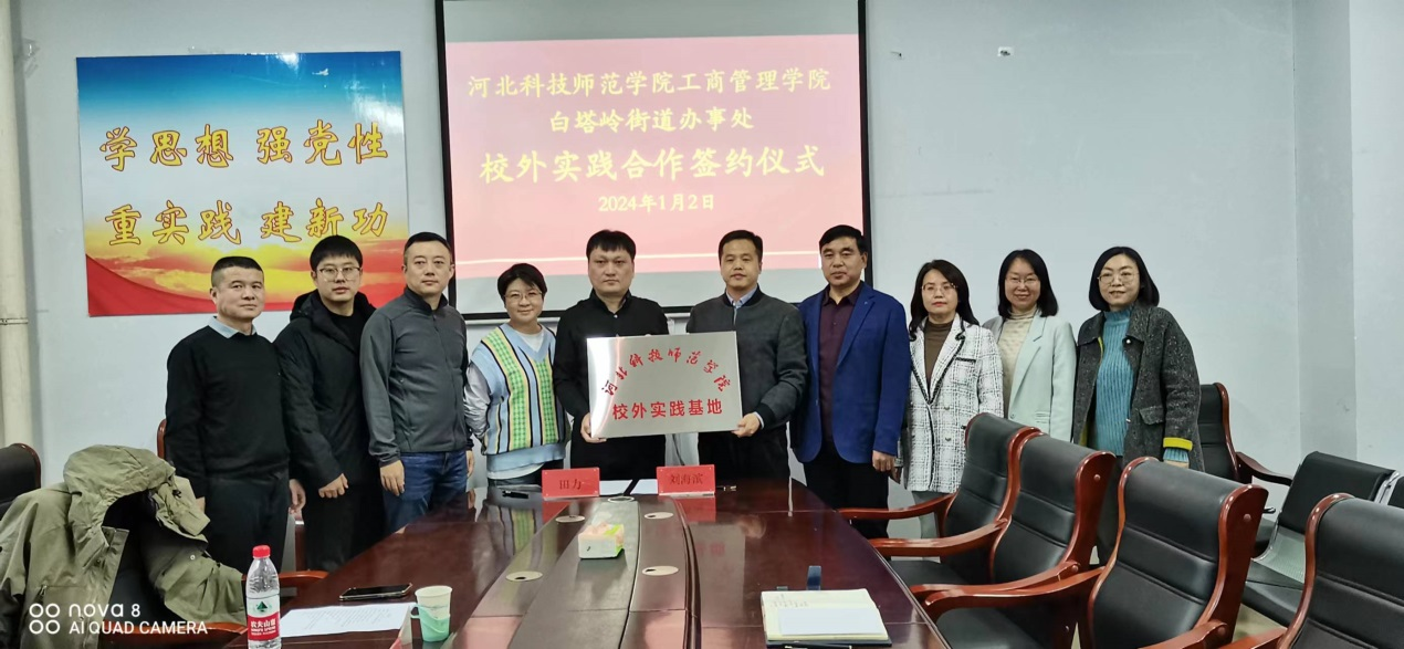 2024年1月2日下午,河北科技师范学院开云kaiyun官网与秦皇岛市白塔岭街道办事处校外实践合作协议签约仪式在逸夫楼608会议室举行。出席本次签约仪式的有开云kaiyun官网领导班子成员及人力资源教学部教师代表,白塔岭街道办事处党工委书记、党工委副书记、办事处主任、组宣委员及党建办主任等五位领导。