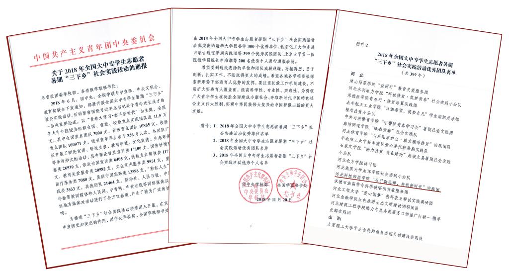 2018年暑假,我校深入贯彻落实省市有关开展大学生暑期社会实践活动的文件精神,共组建全国重点立项团队7支,省级重点立项团队21支,校级立项团队52支和院(系)级立项团队110支。各实践团队紧扣主题,在全省各地,开展了内容丰富、形式多样的社会实践活动。河北日报、河北经济日报、燕赵都市报、河北农民报、河北科技报等70余家媒体先后对我校社会实践活动进行了报道,为我校取得了良好的社会声誉。